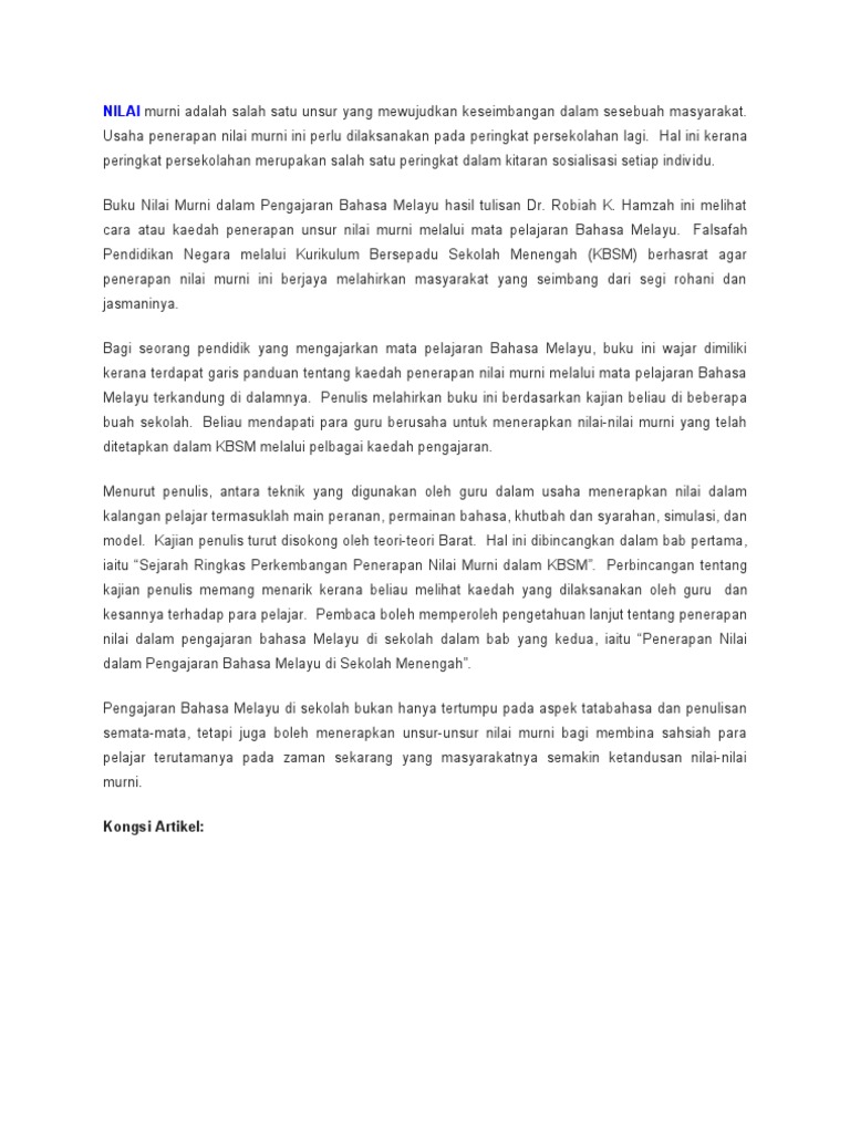 Bagaimanakah nilai murni dapat diterapkan kepada pelajar di dalam bilik darjah dengan berkesan pembelajaran kooperatif adalah berdasarkan konsep ini amat bersesuai dengan cara untuk menerapkan nilai murni dalam proses pengajaran dan pembelajaran. Penjawat awam perlu pegang dan terapkan nilai murni. Menjalankan kewajiban kita dan menghormati hak orang lain. Dalam konteks profesionalisma keguruan, seseorang guru harus mempunyai sikap amanah. Kepentingan didikan agama dan moral. Instrumen yang digunakan adalah soal selidik. Sikap fanatasime pada agama dapat berujung kepada sifat anarki yang merugikan orang lain maka masuk ke dalam pelanggaran pancasila. Draf nilai murni yang amat bermanfaat. Sampel dipilih menggunakan kaedah rawak kelompok. Pengamalan nilai murni sangat penting kerana masyarakat malaysia terdiri daripada pelbagai kaum. Cara meluruskan rambut menggunakan catokan bisa merusak rambut sampai akar. Nilai kerajinan ini dapat dilihat di kalangan pelajar. Cara untuk menerapkan nilai murni dalam diri pelajar ialah dalam pengajaran guru di dalam bilik darjah, guru perlu.