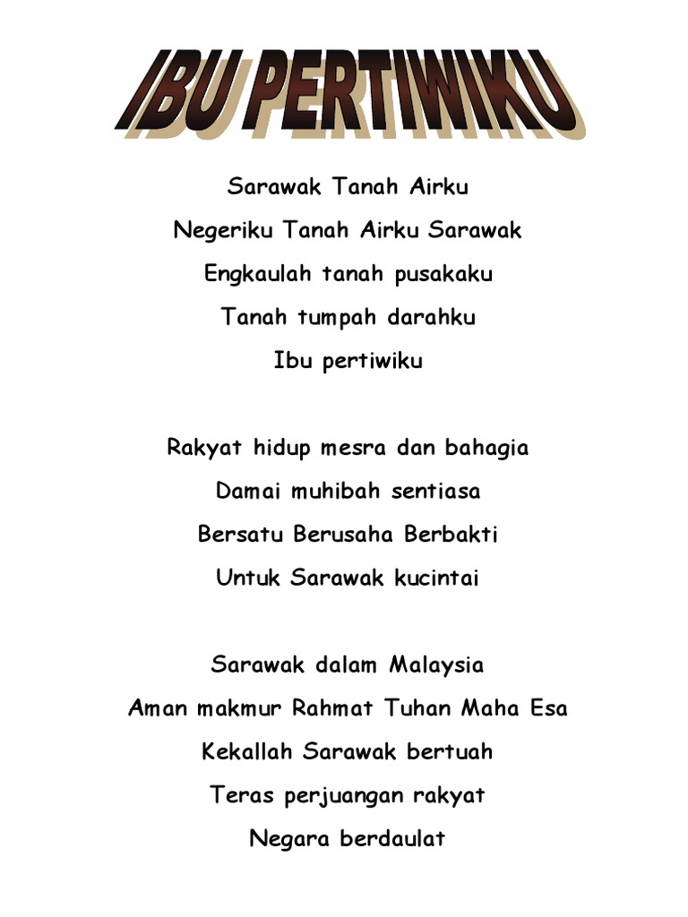 Iki lagu wajib nasional ibu pertiwi lirik ismail marzuki. Rakyat hidup mesra dan bahagia damai muhibah sentiasa bersatu, berusaha, berbakti untuk sarawak kucintai. Free lagu kebangsaan negeri sarawak ibu pertiwiku national anthem of sarawak mp3. Lirik.my.id merupakan website kumpulan lirik lagu baik indonesia maupun mancanegara. , lalu cari berdasarkan nama artis.
