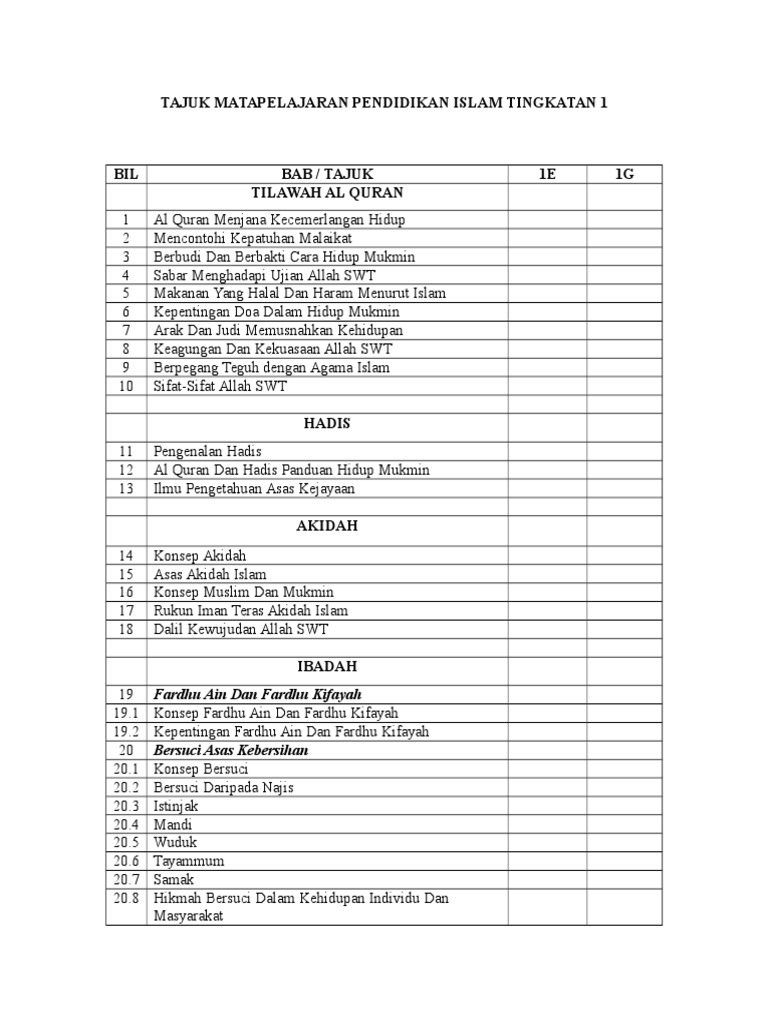 Dokumen standard kurikulum dan pentaksiran. Kurikulum standard sekolah menengah (kssm) merupakan kurikulum baharu yang diperkenalkan pada waktu ketika kssr diperkenalkan di sekolah rendah. Buku teks pendidikan islam tingkatan 1. Ujian mac pendidikan islam tingkatan 1. Pembelajaran kendiri adalah diutamakan dalam buku ini supaya murid dapat.
